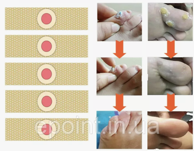 Пластир проти стрижневих мозолів, мозолів на п'ятах — справжня знахідка проти сухих мозолів, натоптнів і бородавок. Пластир стане чудовим помічником у боротьбі з цією проблемою. Пластир можна розміщувати як на стопах, так і на пальці ніг. Знеболювальний пластир виготовлений із повітропроникного та гіпоалергенного матеріалу, який добре прилипає та приємний до шкіри. На поверхні пластиру розміщується спеціальне кільце для контакту з проблемною зоною, дпна частина просякнута антибактеріальним складом.